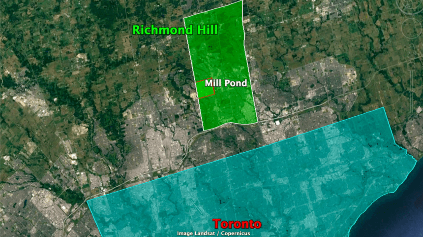 Mill Pond 是列治文山西部中间位置的一个社区。社区南北夹于 Major Mackenzie 与 Elgin Mills,东西夹于 Yonge 与 Bathurst 之间,面积约4平方公里。社区的历史可追溯到19世纪30年代,这在加拿大自然算得上历史文化遗产了。1835年,一个名叫John Lanstaff 的人带着他的家人来到了Mill Pond 一带定居,在 Don River 的支流上挖了一个水塘,筑了一个大坝,用水作动力修建了一个锯木厂。Mill Pond 这个名字也由此而来。从那以后,星换斗移,John Lanstaff 与他的伙计们在此地辛勤劳作,繁衍生息,逐渐形成了小有规模的 Mill Pond 社区。
