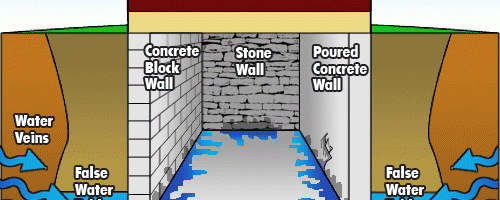 当雨水持续汇集,来势迅猛的时候,地下水的地下通道会溢满。水就会向上涌到水道上方的土壤里,填满所有的缝隙,最后达到土壤的饱和。当水位持续升高,地下水就会达到或高于房子地基的水平,形成了我们所说的假地下水位。这样,房子地基整个处于地下水的包围圈内。我们知道,静水压力是63.4磅/立方尺,这么大的压力作用在地基的外墙,房子地基进水就可能是顺理成章的事情了。