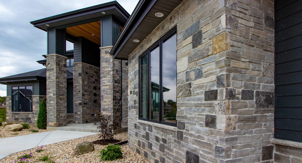 为了环保和降低成本的考虑,厂家发明了人造石头。人造石头的英文名字很多,比如:faux stone, artificial stone, cultured stone, manufactured stone 等等。人造石头基本上是以水泥为主要材料用模具加工成型。其外形和颜色多种多样, 可以模仿很多种天然石头。人造石头是目前市场上的主流,就是说你所见到的很多石头外墙的房屋,实际上并不是用天然石头,而是用惟妙惟肖的人造石建造。为了加强效果,拐角处的人造石常常被模具做成 L 型,这样给人的感觉整个房子的石头非常厚实,效果更好。